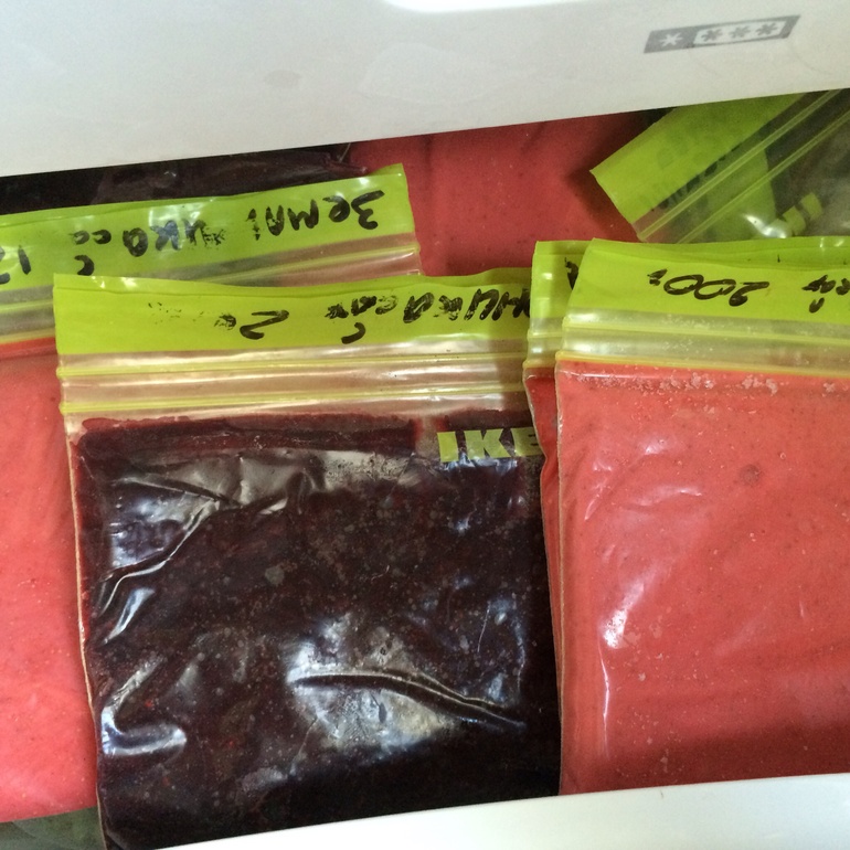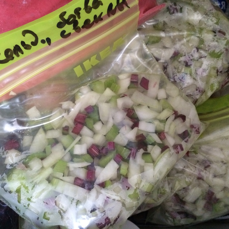 - порезать и разложить по пакетикам заготовки для конкретных супов (борщ, овощной, щи) или овощных рагу (или пюре, если хотите готовить детям): кубиками-кусочками тыкву, цветную капусту, брокколи, морковь (или на терке), лук, помидоры. Единственное, что не морожу, это картошка, она потом резко теряет во вкусе.