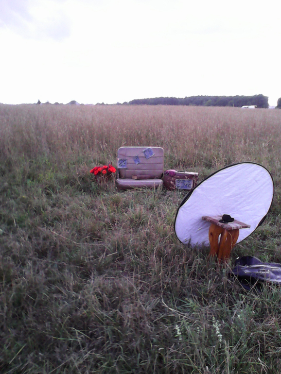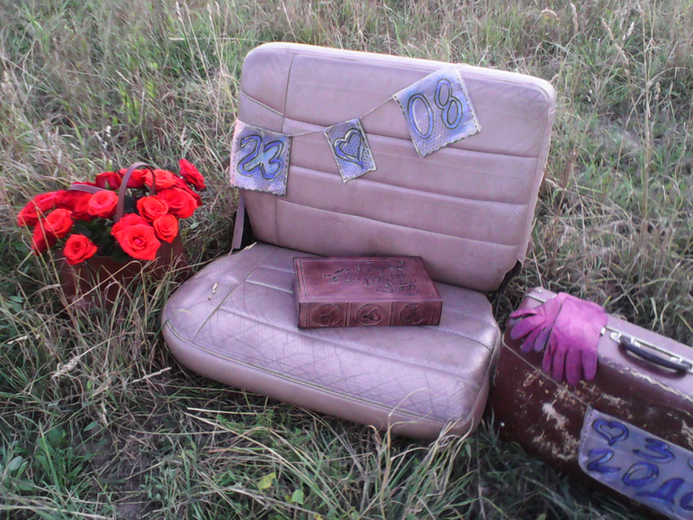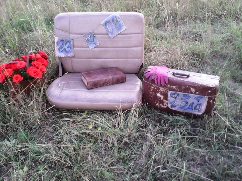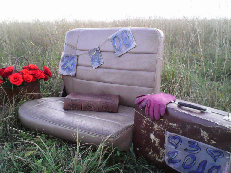 О хорошемУ нас с мужем вчера было 3 года свадьбе. Отмечали фотосессией. 3 года - это кожаная свадьба. Мы взяли кожаное кресло от авто, помтавили его в поле, в высокую траву, рядом поставили старый чемодан, кожаную сумку, в которую я поместила букет алых роз, качестве аксессуаров у нас были кожаные перчатки, куртка-косуха мужа, и книга в кожаном переплете. В предзакатных лучах солнца мы снималтсь такюе на копоте нашего джипа, в общем , экспериментировали. Теперь ждем фотографий, а у меня есть несколько фоточек с телефона. Хорошо вот так отмечать годовщины: и фото на память, и простор для творчества ( я из кожи делала гирлянду с датой, но я не довоььна результатом, хорошо, акриловые краски кожи хорошо смываются, можно переделать), и платье вадебное можно выгулять:) е
