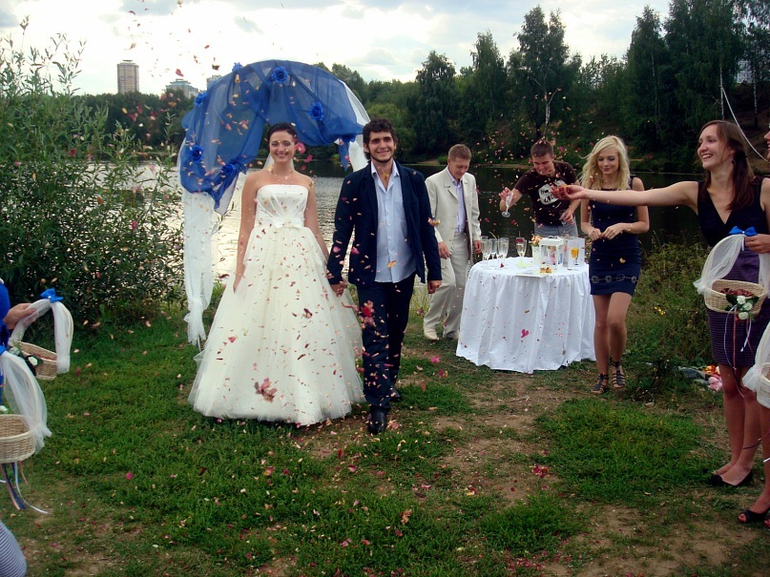 И несколько фото со свадьбы, чтобы платье посмотреть. Бант я сейчас отпорола, но его при желании можно вернуть легко. Просто сейчас локаничные более актуальны, а в 2011 бантик был в тему :)