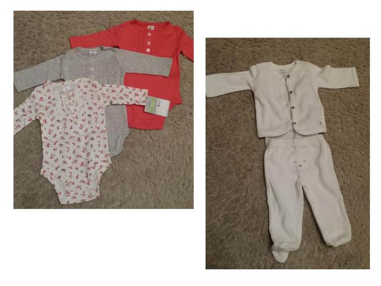три боди с длинным рукавом (ну а че, у меня же зимний ребенок) значатся на 3 месяца и белый махровый костюмчик с медведем на попе и боди тоже туда же. вроде тоже картерс