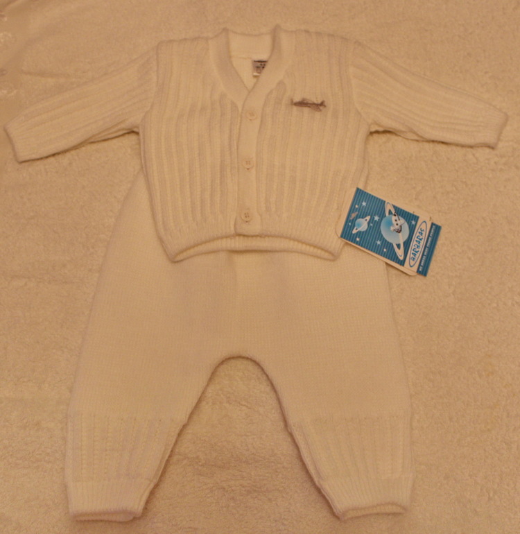 И сверху оденем вот такой супер-тепленький костюмчик. Он белый с вышевкой самолетика, мне очень нравится. Еще хочу носочки вязанные и шапочку тепленькую.