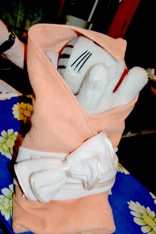 Сшила, а душа требует творить:) И решила я из огрызочка флиса сделать вот такой конвертик (двойной получился) с флисовой лентой на липучке. Моделью служил кот, по размеру крупноват, но лучшее что есть:)