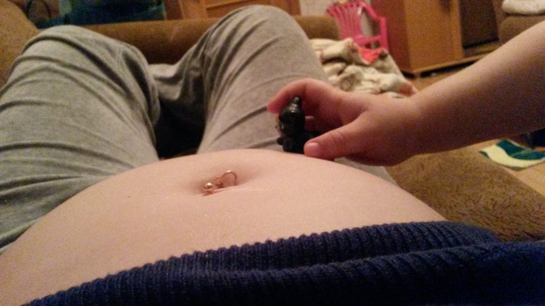 Игры среднего сына с младшим в пузике. )) один типа собачка по пузы прыгает , а второй в пузе ответно пихает)))