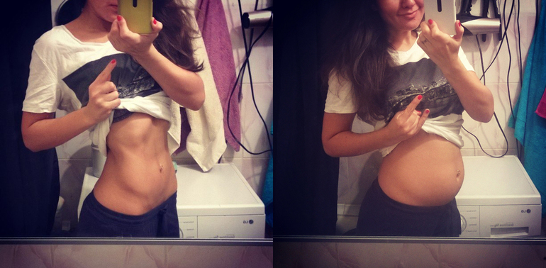 Левое фото - первый месяц, тогда я еще не знала о положении. Хвастаюсь в инстаграме результатами работы а тренажерке.