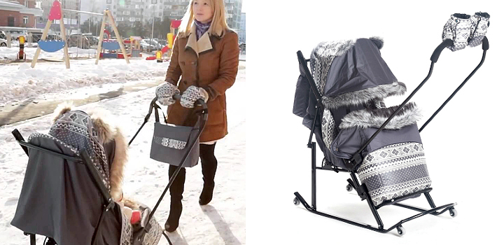 Разумеется, если речь идет о настоящей зиме, коммунальном коллапсе или прогулке за город, любая, даже суперпроходимая коляска сдастся перед снежными наносами и сугробами. В этом случае выручит коляска-сани. Это может быть как полноценная модель, представляющая собой утепленный прогулочный блок на шасси с полозьями, так и трансформация обычной коляски, когда на место колес к раме прикрепляются специальные лыжи для детских колясок.