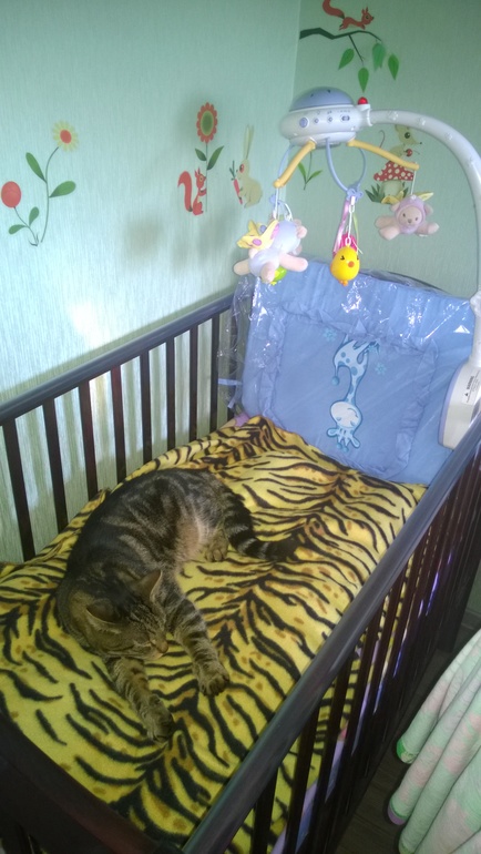 хааа, Котэ явно доволен переменами) лежит с барским видом) а потом малыш появиться, мне кажется, будет с ним в обнимку спать в кроватке, а как заплачет- будет убегать и прятаться под диван)) мобиль — да, точно его очарует, когда будет включен) кстати, для малышей рекомедуют после месяца его, что типа они пугаются , но мне кажется, можно и раньше))) скоро- скоро малыш попросится на выход)) про носки ооочень смеялась)))