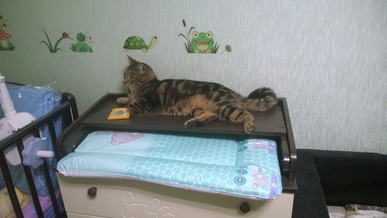 так конечно, наверное, потому что молоком пахнет :) Я надеюсь, наша кошатина добровольно покинет детское место обитания, хотя б на первое время, пока еще карапуз не может сдачи дать.