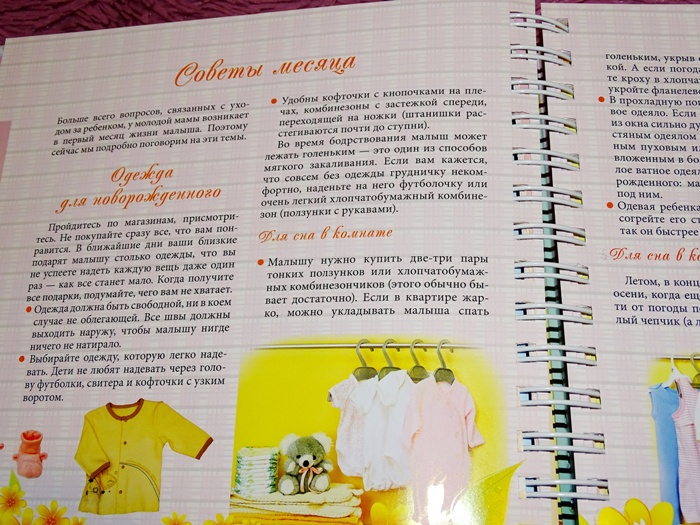 Плюс в начале каждого месяца даются СОВЕТЫ МЕСЯЦА, например 1 месяц:одежда для новорожденных, где и как спать,учимся чувствовать друг друга, кормление малыша, сколько спать и как уложить ребенка ну т.д) Все очень легко изложено, ярко не нудно.