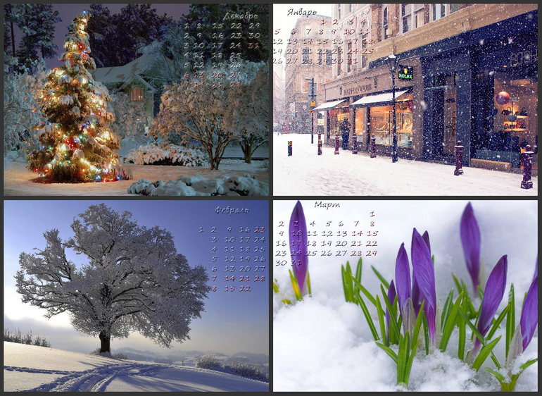 О хорошемСняли полки со стены, а раскуроченные дырищи остались! Ну понятное дело, надо завесить чем-нибудь)), картиной, например. Я и в интернете смотрела и хотела поехать к переходу у метро Парк Культуры (там круглый год выставка-продажа картин всяких разных-разнообразных). Потом я захотела повесить фотки моего любимого Ясенева, это перешло в желание лицезреть просто красивые зимние пейзажи, будь то город или на природе… А что бы увеличить функциональность сего проекта, решила нанести на картинки календарные числа, с декабря по март.