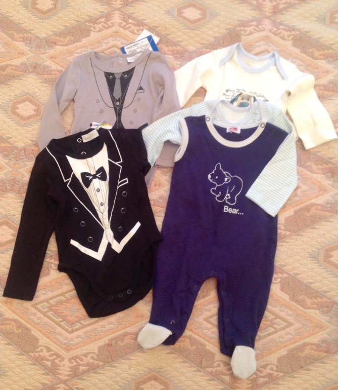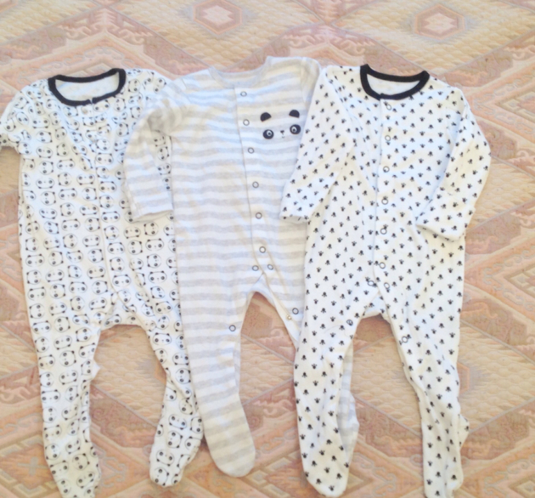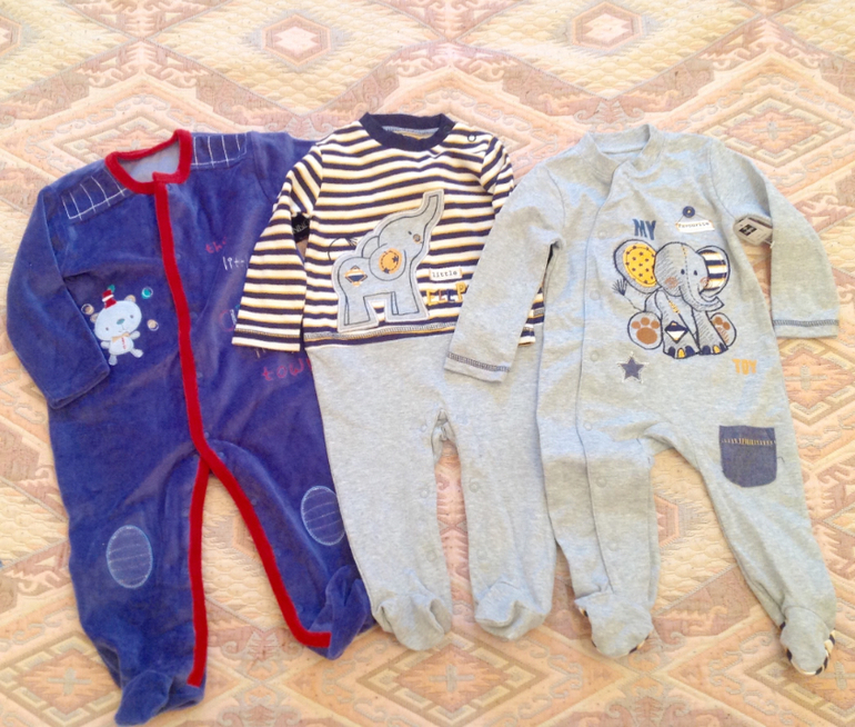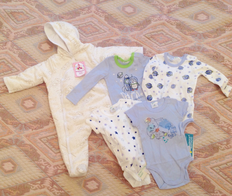 Вещи все разного размера. Пара ромперов (первое фото, нижние) на 56 см, остальные на 62, в основном. Но есть и 68 и даже 74.