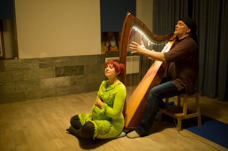 Но мне повезло. Элизбар всё же приехал в Москву и на 36 неделе мы с мужем посетили его арфотерапию. Причем мы были как на групповом сеансе, так и на индивидуальном.