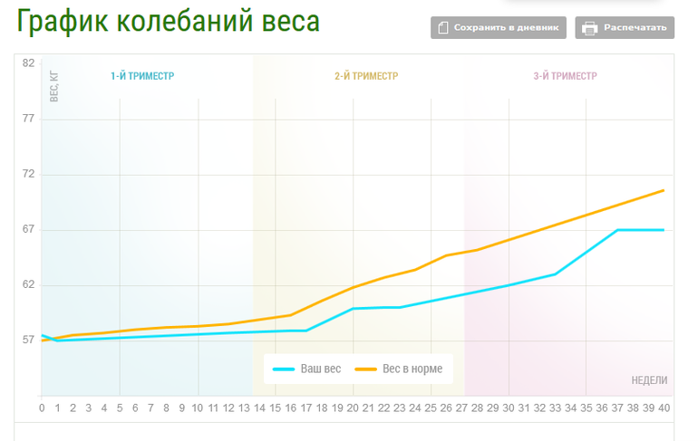 Как можно увидеть из диаграммы, вес я набирала скачкообразно. Основной набор пришелся на 7 - 9 месяц беременности. В принципе, вес в норме.