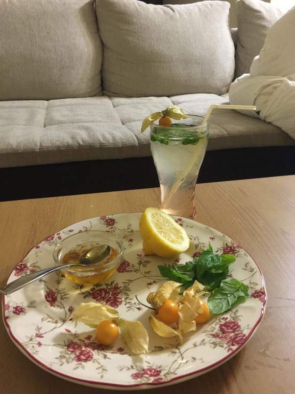 Сделала себе анти-токсикозный мохито из тех продуктов, что мне помогают: мята, мед, лимон, Боржоми, лед :)