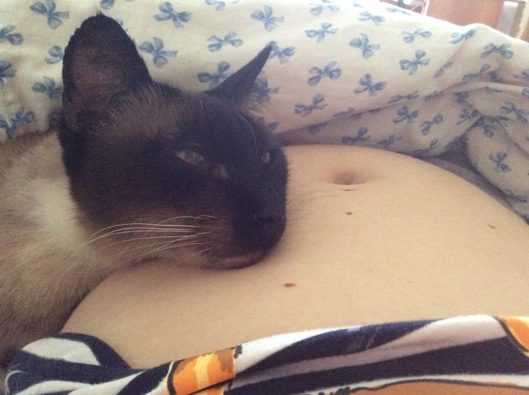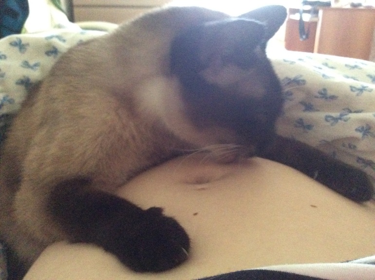 хех,сама на днях такую фотку фоткала,и кот окраса,как у вас почти)))Тоже обнимает и любит на живот пристроится.Правда минут через 5 кот начинает смотреть на живот и недовольно уходит,лялька сгоняет...