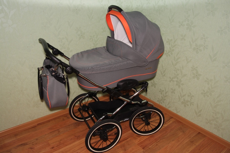 Поворотные передние ( и огромные!!!) колеса, большая люлька, планирую что будем в ней спать минимум до марта. Немного тяжеловата ( люлька+шасси 17,5 кг), но я собираюсь с ней нарезать круги по парку и худеть, надо же как-то будет приводить себя в форму)))