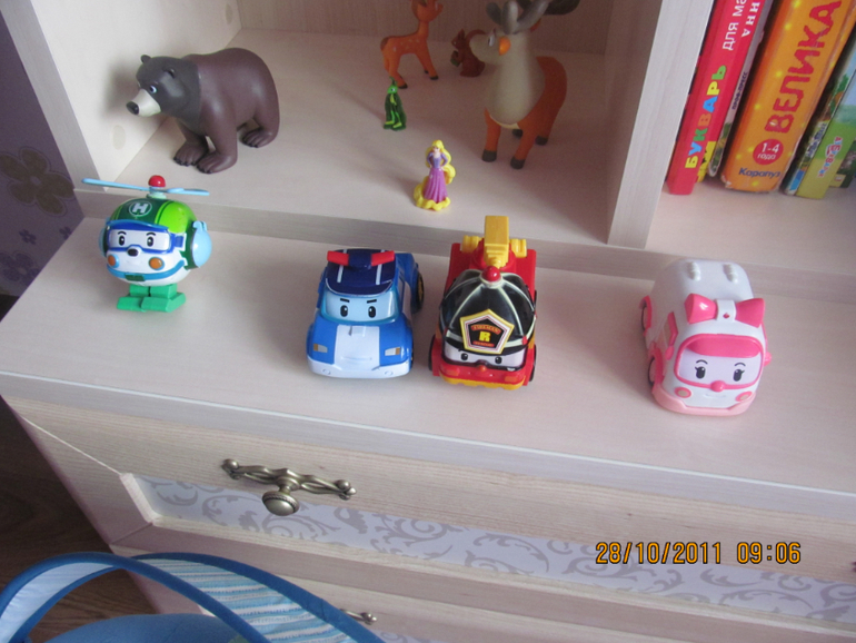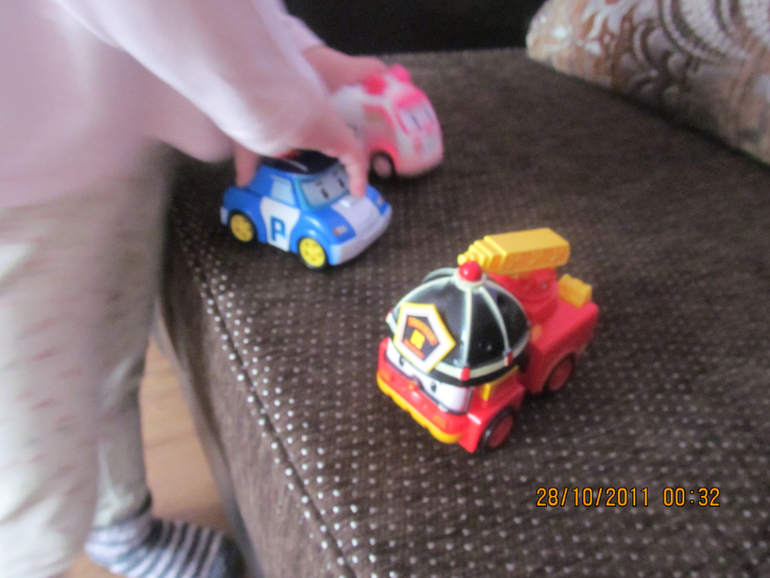 Настя играет сама , потом просит включить мультики про любимых Поли Робокар .