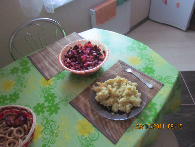 Ставлю готовить ужин . Овощной плов и винегрет . Саша капризный ,поэтому готовлю урывками . Ношу его из комнаты в комнату .