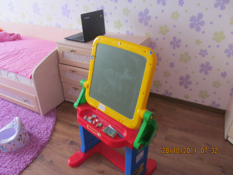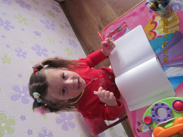 Иногда просится на ручки . Меняем подгуз пока Настя пишет. как может , буквы.