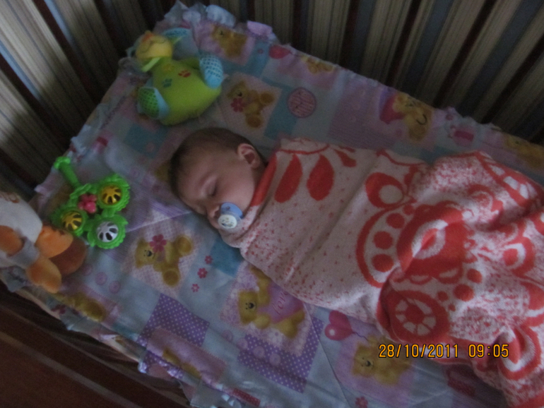 поэтому мой завтрак откладывается . Саня кушает мамино молочко и ложится на первый сон . Спит он очень мало , хорошо если минут сорок поспит( Я пока кушаю и вытираю пыль.