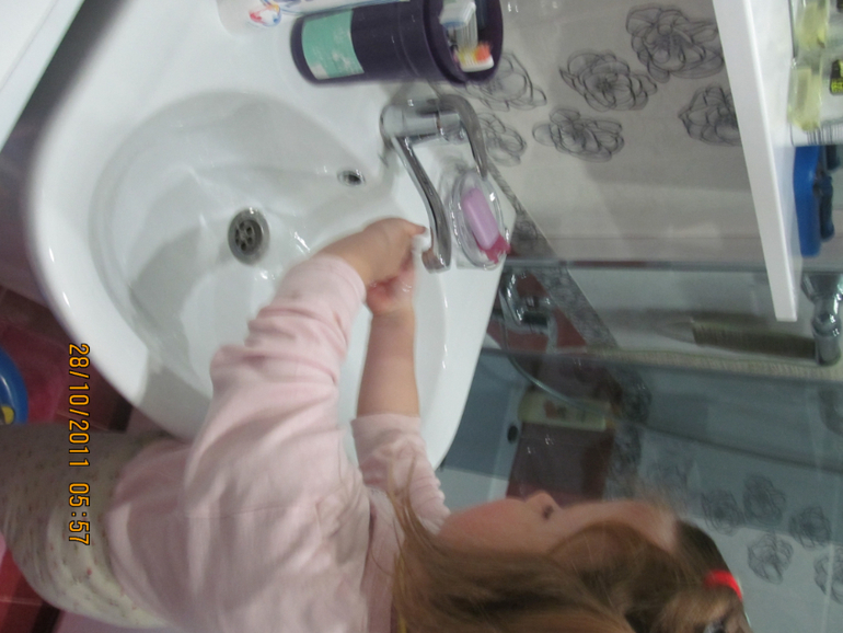 Санька готов , помогаю Насте переодеться и умыться. Она уже многое делает сама .