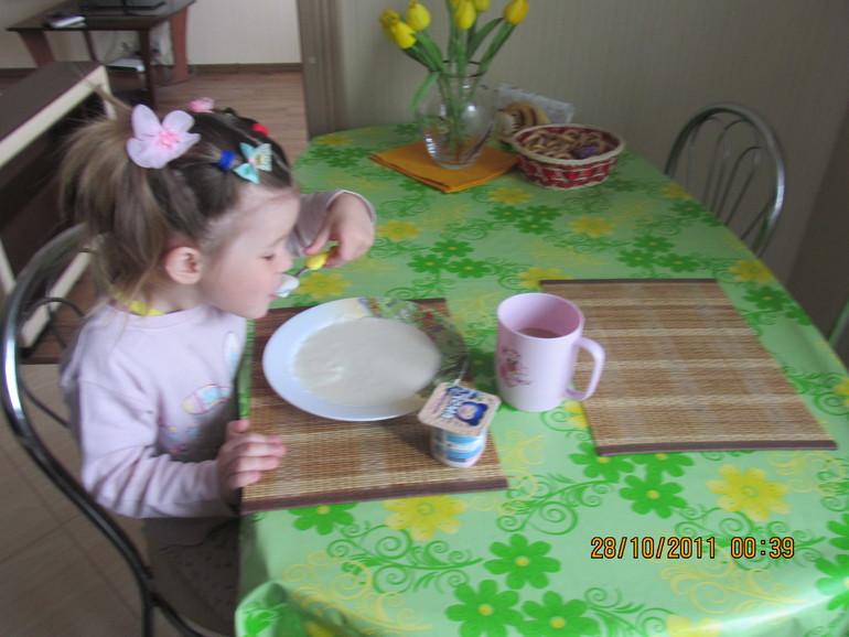 Итак . Просыпаемся все вместе в 8 часов 20 минут.Папа уже ушёл на работу .