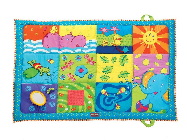 Нам подарили на первые смотрины,т.е.коврик был с самого начала. У новорожденного он не представляет никакого интереса. Это скорее к варианту 4. Где шуршит,пищит, зеркальце,игрухи-там малышу будет интересно. А этот коврик мы использовали просто как ковёр,чтоб на полу не холодно было. Но когда малыш начинает ползать и это уже не актуально. Потом был один интерес-отковырять деталь и в рот. Думаю 2-3 года будет интересно,когда ребёнок будет осознанно собирать пузлы,но надолго ли хватит? Мелкие детали очень быстро теряются...