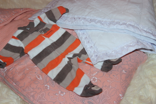 Приданое для малышаНа этот раз подарки от свекрови - я ждала ее приезда полгода! Купила мне еще один флисовый комбезик Картерс, а также сшила сама мне конверт (вкладка 300 гр поларфлис) на молнии и одеялко в него (или просто в коляску).