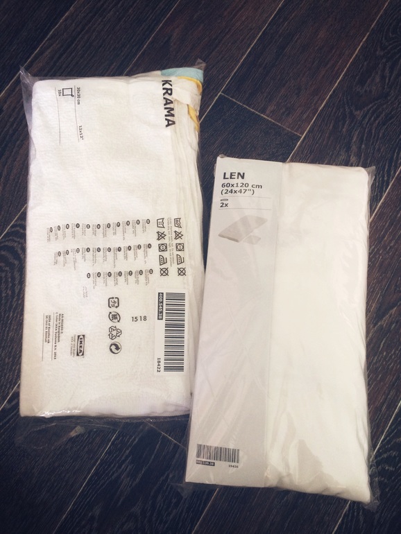 В икее были приобретены полотенчики, натяжные простыни, ванночка и тканевые коробочки для детского комода ;)