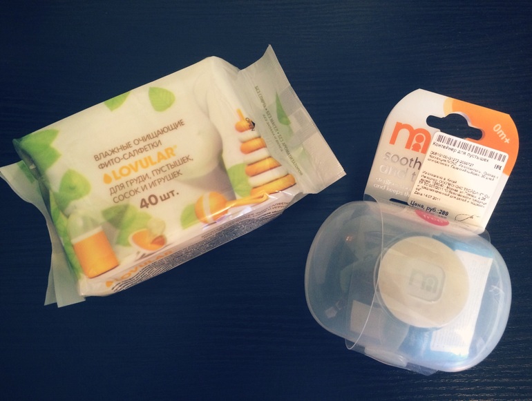 Ну и прикупила еще всяких мелочей: пустышку-термометр, бюстгальтеры для кормления, всякие влажные салфетки, детскую зубную щетку, коробочку для сосок и прочее ;)
