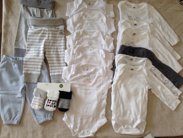 , 2 слипа неизвестной мне турецкой фирмы размер 3-6 месяцев, комбез плюшевый из h&m 62 размера (это я планирую одевать как верхнюю одежду в октябре/ноябре), а на зиму видела тоже в h&m комбез на синтепоне, но его купим, когда мальчик уже родится и будем точно знать его рост и пр. Нам тут просто, если что, спустился вниз в молл и купил, что нехватает, поэтому я не закупаюсь много. Мама привезет наборчик на выписку и потом пока вырастет из размера 56 + слип с жирафом 56р + слип велюровый серый заяц 62р