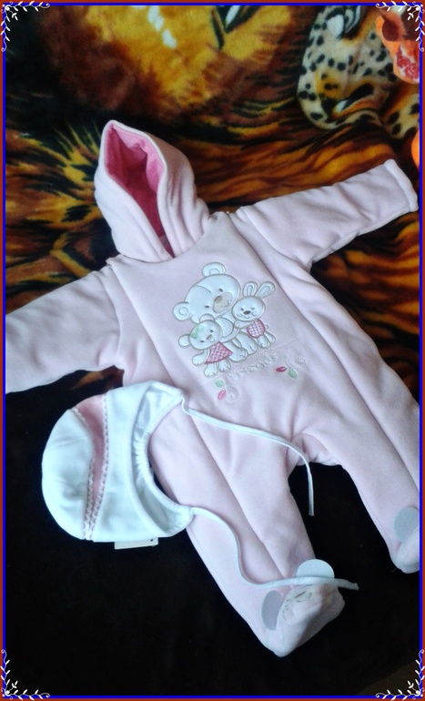 А наверх утепленный комбинезон с теплой шапочкой тоже розового цвета: