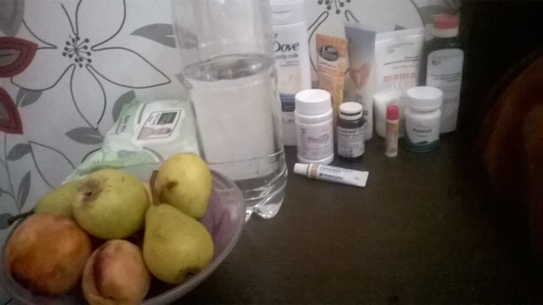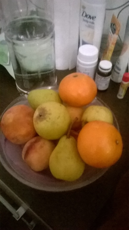 Фрукты, сегодня это груши, персики и мандаринки( ещё не ела их как забеременела), а так же вода минеральная не газированная(стараюсь пить 2 литра воды в день)