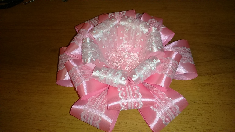 сестра большая молодчинка, ручки откуда надо - бант красивый. хотя у меня к ним предвзятое отношение - не люблю, когда детей наподобие посылки праздничной упаковывают, но тут на вкус на цвет, как говорится, а сделан бант аккуратно и с душой.