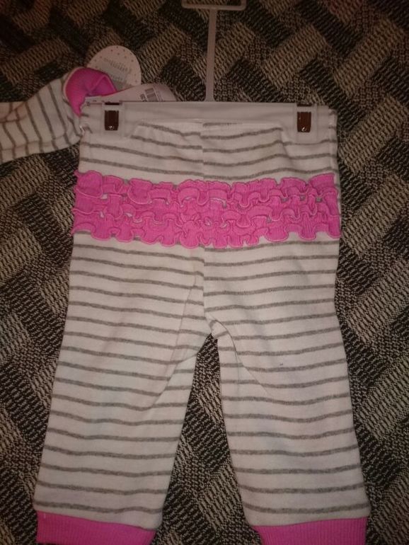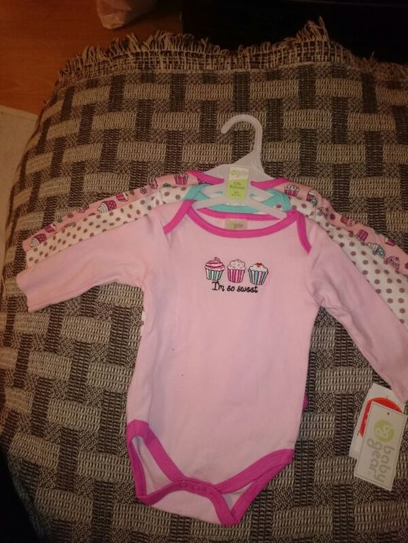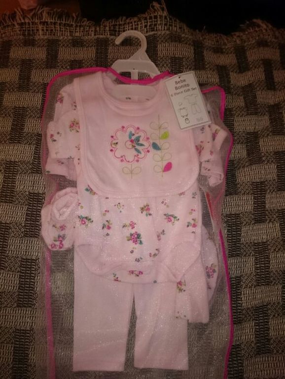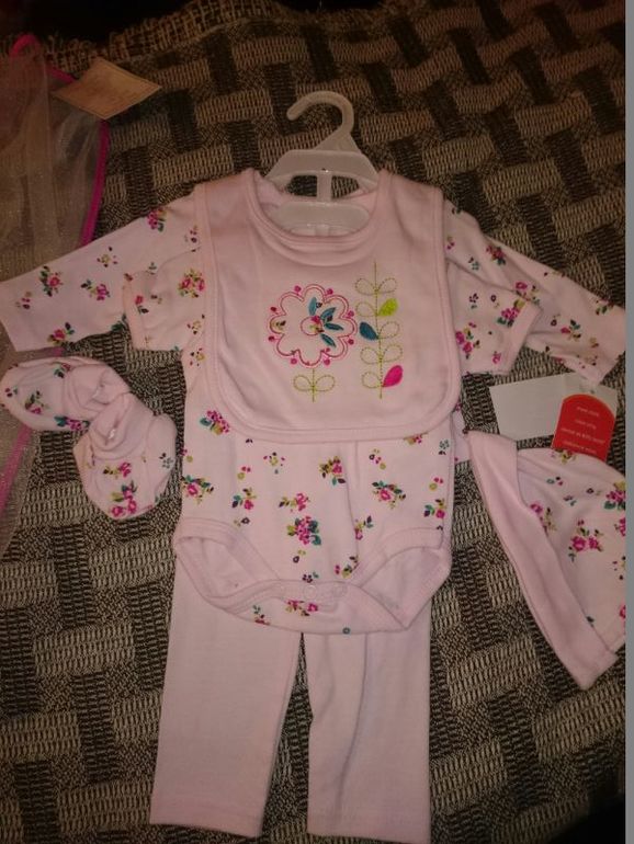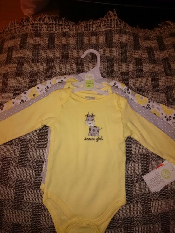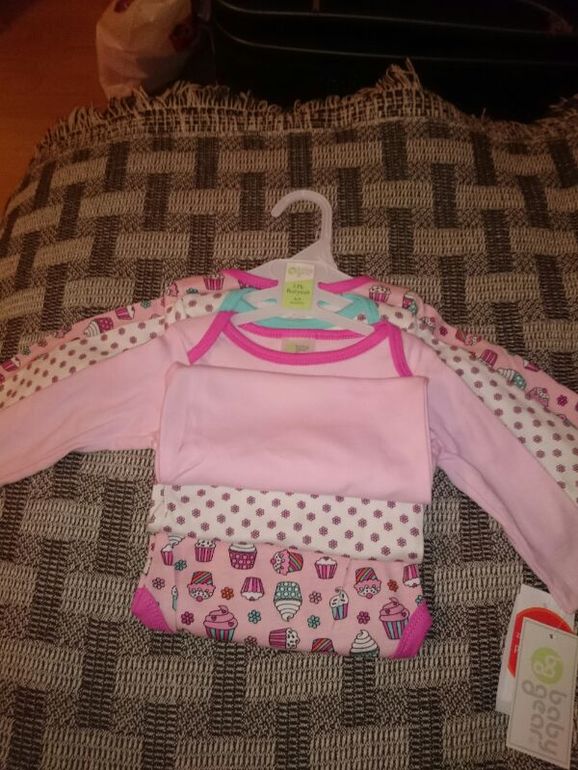 Качество фото возможно не очен..вживую вещи очень красивые цвета.Один набор размером 0-3 м и штанишки.Все остальное 3-6 месяцев.Пришла домой любуюсь))))Моя мама конечно еще хотела что-то купить..но говорю НЕЕЕТТ хватит.Нужно список смотреть))))))Это не первые наши покупки.Уже чемодан вещей разных размеров и игрушек ждет свою хозяйку))))