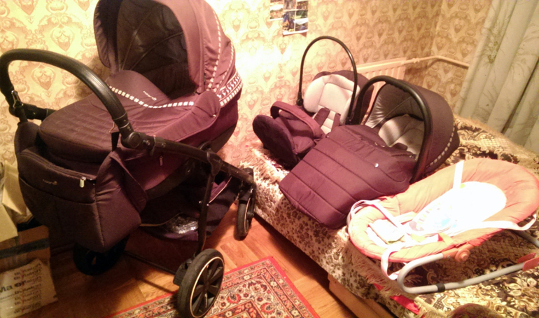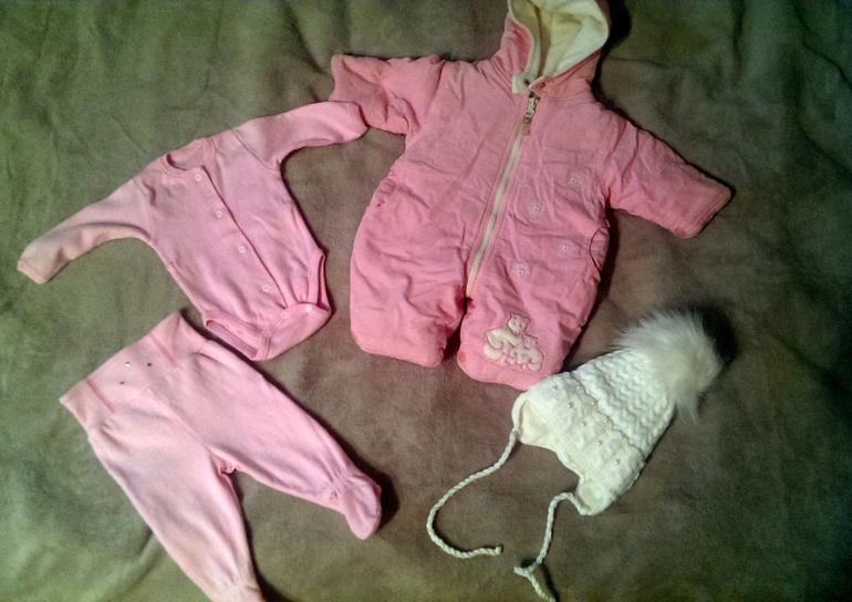 Боди, штанишки, шапочка тонкая(нет на фото), шапочка теплая, комбез зимний теплый, наверх конверт на овчине, ну и ленту взяла)) До машины так, в машине из конверта достать и в автокресло.