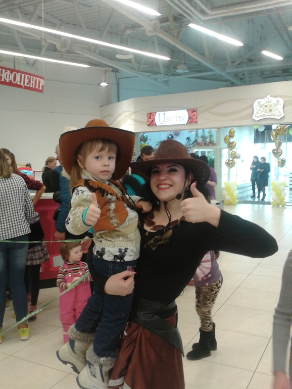 Сегодня муж молодец сводил нас с дочей на развлекон в торговый центр, вестерн- кантри шоу. Мелкая хотела покататься на каньках, там был искусственный каток, но мне запретил её сопровождать, хоть я и рвалась в бой.. а сам скрывал что не умеет и боится. Так что доча дулась на весь мир. Придётся ей ждать лета, когда я распузачусь... Так что просто потусили и и устроили шопозыринг в местных бутиках. Хотела выбрать себе что- нибуть в беременном отделе, но там такой страх, вам не передать и откуда берутся такие страшные модели...., я их называю - прощай брак и привет одинокое чучело на огороде. Лучше на Wb что нибудь выбрать. Фото дочи 3.1 года с артисткой, очень ей наш костюм приглянулся, не зря я колупалась двп вечера, всё для детей!