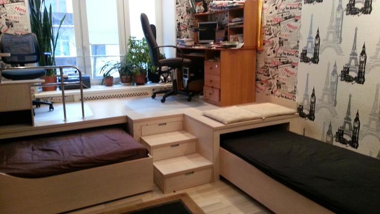 В плане риска, очень удобно, и лестница удобная и упасть маловероятно, но по мне так самый удобный всё же вариант с выдвижной второй кроватью, у нас стоит подобная той, что вам нравится, очень уж давит эта громоздкость, комната в разы меньше с ней кажется, я лично жалею что её купила, вот первый вариант у нас, а второй -который мне больше нравится .