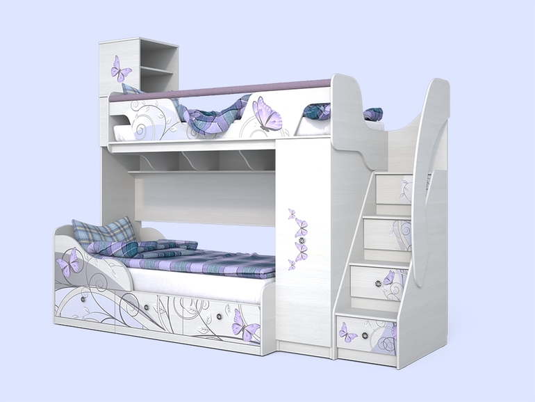 Если бы у меня были девочки, то такую же бы взяла))))Но у меня два мальчика, старшему два с половиной, младшему 8 месяцев. Сами подумываем о подобном варианте. Я думаю, что старшая достаточно большая, чтоб не упасть с верхней полки. мы с сестрой в советское время на такой спали (конечно она была не такая красивая). когда я перебралась на второй этаж мне было около трех лет. Упала оттуда только один раз и без повреждений. А если боитесь за падение, то можно бортики нарастить и обыграть это, предположим, в виде крыльев бабочки. А на счет лесенки- ящичков, я думаю, что она вполне удобная для подъема, тем более, что в них можно игрушки убрать. Я бы так и сделала. Но это мое мнение. Надеюсь помогла)))