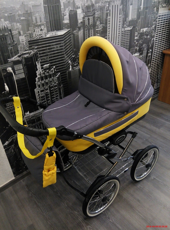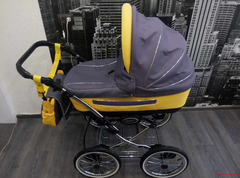 В серо-желтом цвете. Что могу сказать.. она шикарна!!!)))))) Я довольна как стадо слонов))) Огромные надувные колеса, едут очень мягко и бесшумно, амортизация отличная, качать ляльку можно одним пальцем, разбирается и собирается очень легко и интуитивно понятно. Из минусов только вес. Да, тяжеловата... но я все равно довольна))) Брали с рук, после 1 ребенка. В 4 раза дешевле, чем новая с магазина. В комплекте люлька,прогулочный блок (им хозяева вообще не пользовались, он новый), накидка на ножки, 2 москитных сетки, дождевик, матрасик, сумка для мамы.