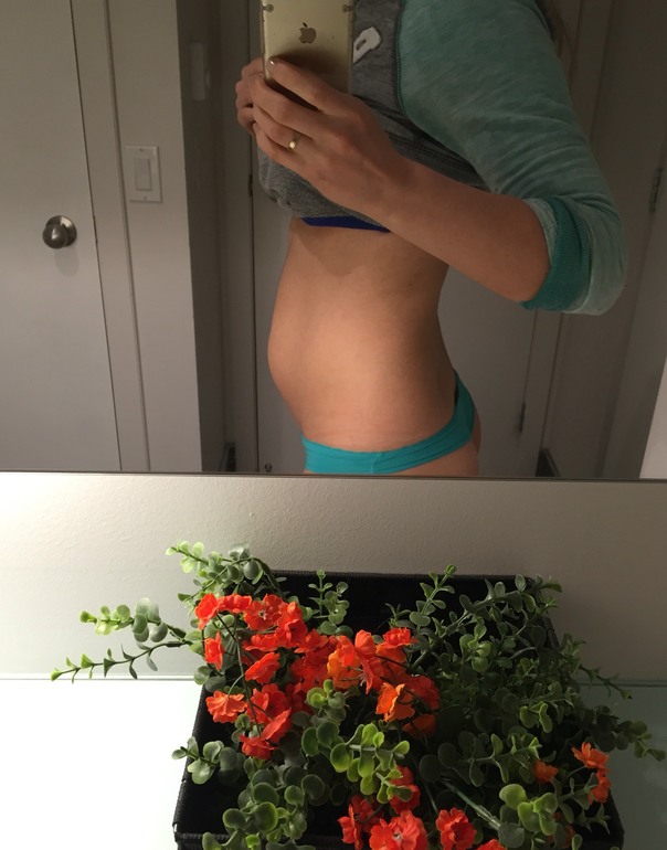 где-то прочитала, что к вечеру больше животик вываливается у тех, у кого пресса нет, но мне кажется странной эта теория, потому что у меня как раз к вечеру вываливается больше, но при этом пресс до беременности в форме был, планку по 5 минут стояла!