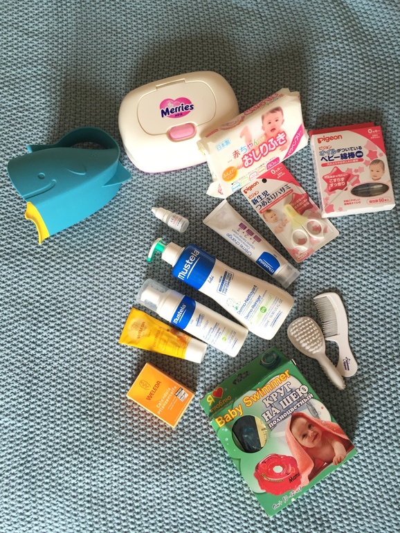 Милейшая лейка skip-hop, круг на шею для заплывов в ванной, гель для купания, шампунь от корочек, крем под подгуз(мустела), крем и мыло (веледа), ножнички, тонкие ватные палочки с пропиткой масляной(пиджен), салфетки японские без запаха. И расчески( с Гришей совершенно не пригодились) ещё за кадром ванночка со встроенной горкой. На первое время и когда лень большую ванну набирать. Очень удобно мне было с Гришей) положил в эту горку и руки свободны.