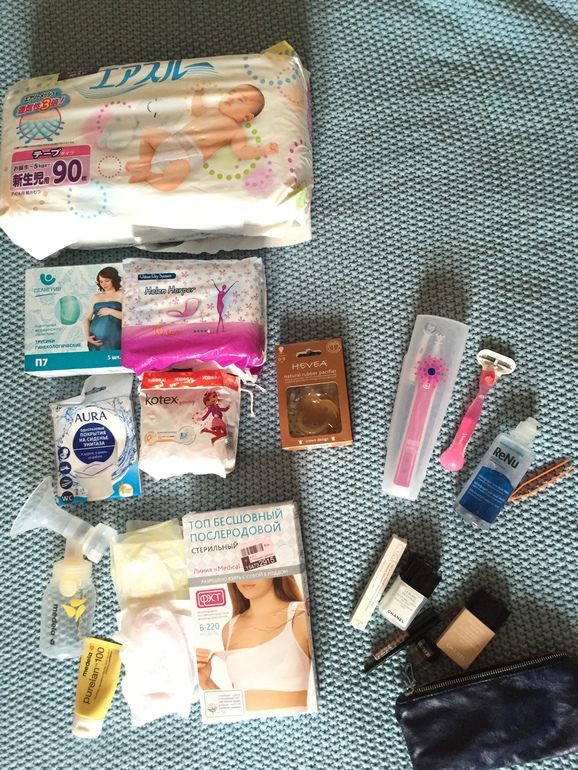 Полотенца 1 большое, 1 маленькое, вещи на выписку малышу, носочки, пара слипов, 3 пеленки одноразовых, вещи для нахождения в рд для меня, крем, дейзик, гель мустела( для нас обоих). мне шампунь, расческа. нужно еще доложить вещи и обувь на выписку для меня.