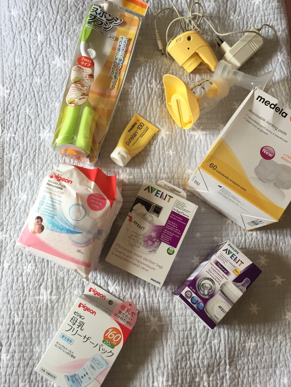 Молокоотсос медела, вкладыши для груди медела и пиджен, пакеты для стерилизации бутылок в микроволновке авент, пакеты для заморозки молока пиджен, губка для мытья бутылочек, сама бутылочка авент и куча пустышек))