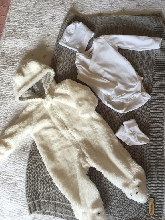 Комбез медведь 62 р-ра(летом в Москве вообще ни разу не жарко, будем, думаю, постоянно использовать), боди с коротким рукавом, боди с длинным рукавом и слип. Выберу что надеть уже в роддоме по погоде. Плед, чепчик, носки. На месте разберёмся)