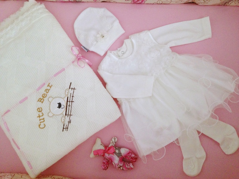 Я не планировала покупать на выписку что то особенное, думала выберу из того, что уже есть. Но нам сделали подарок, поэтому на выписку у нас платье, и пледик на случай прохладной погоды: