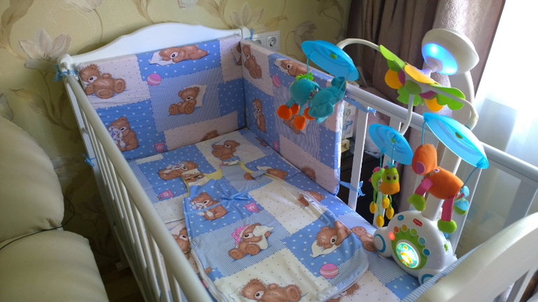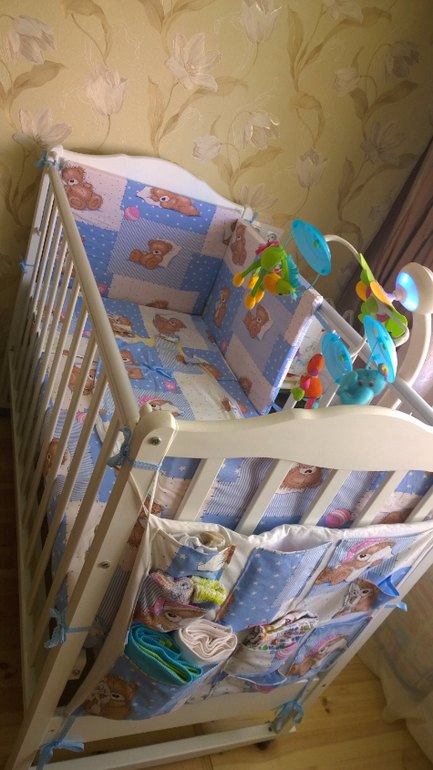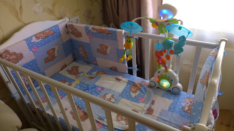 Вот так выглядит кроватка. Так было с дочей - сон на одну сторону, мобиль и игрухи на вторую))