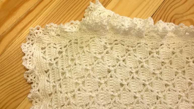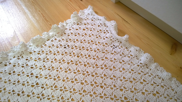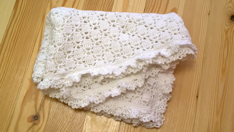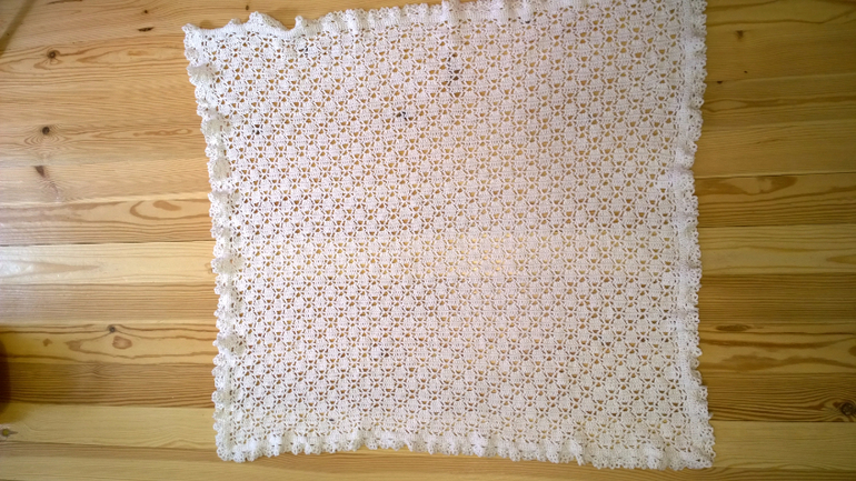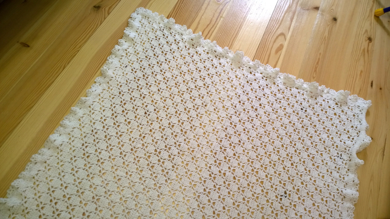 А это моя любовь! Плед на выписку. Пряжа классная, мягкая, 100% хлопок. "Schachenmayr original. Egypto cotton" Здесь только-только довязала, сейчас уже постирала, форма лучше стала. Мяяяяягонький!!!! Наверное 90х90, точно не измеряла, от 85 с хвостиком до метра, примерно. Хотела двойные кружавчики для обвязки, но что-то мне в них не понравилось. И саму обвязку сделала проще, не понравилось мне с последним рядом, убрала его. Для мальчика получилось идеально, зачем нам рюшечки?