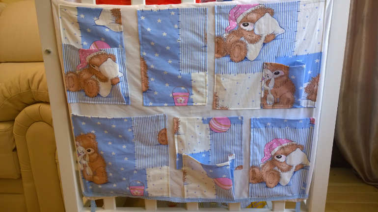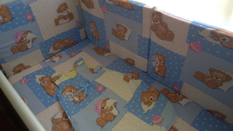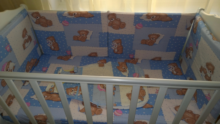 Простыню на резинке, наволочку и пододеяльник тоже сшила. Бортики только на три стороны, с дочей переднюю стенку не закрывали вообще. Из 4 частей для того, чтоб удобно было цеплять мобиль. Внутри поролон 3 см.