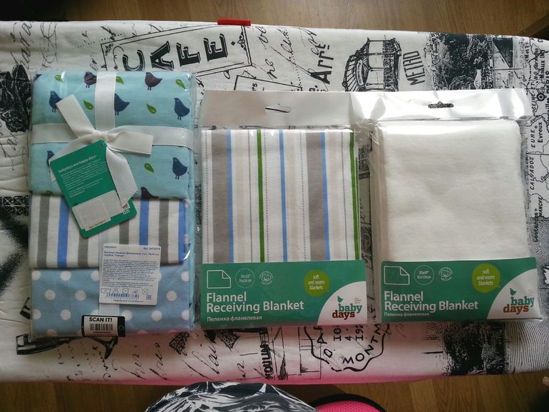 2. Пеленки фланелевые. У меня 4 пеленки для подстилания 76*76 и одна (белая) большая 120*85. Пока не знаю для чего мне большая белая, может просто как простынь в кроватку буду использовать. Но для пеленания я другие варианты выбираю.