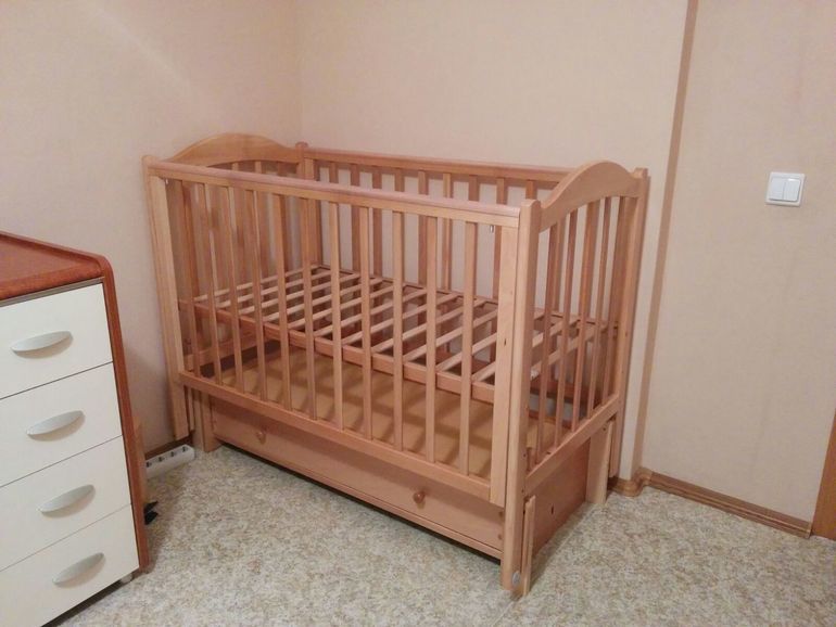 6. Кроватка Кубаньлесстрой «кубаночка-2». Продольный маятник, 3 положения дна, 2 положения передней стенке и стенку полностью можно снять в будущем без разбора кроватки. В передней стенке 3 рейки вынимаются. Есть ящик, хотела без него, но под мои требования не нашлось кроватки без ящика. Сразу было решено - пусть будет маятник, лучше заблокировать его, если не понадобится, чем переживать, что его нет. Пользовалась им нечасто, укачивала на руках, а в кроватке подкачивала, чтоб не проснулся ребенок, когда перекладывала его. Сейчас уже заблокирован (блокируется деревянными штырьками). Дата покупки - ноябрь 2015 года, 8000 руб. Слева на фото комод, на котором пеленаю.
